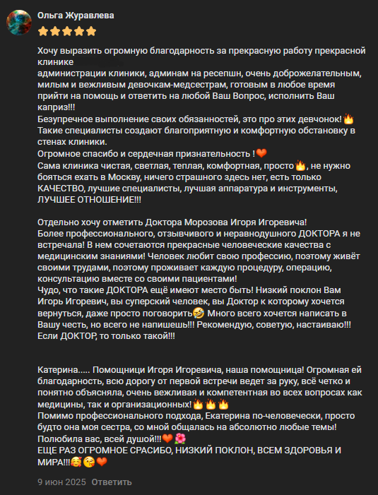 Забота после операции1 сутки под наблюдением в комфортабельном стационаре. Контрольный осмотр перед выпиской. Вы получаете все рекомендации и наш постоянный контакт.